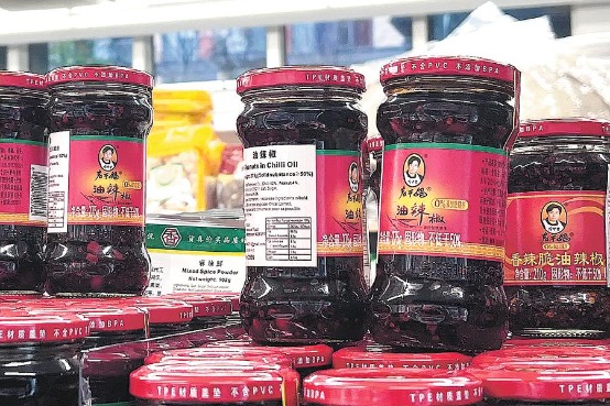 Пълен рафт с чили сос Lao Gan Ma се вижда в супермаркет в Лондон, Обединеното кралство, в четвъртък. Wan Jindong / за China Daily