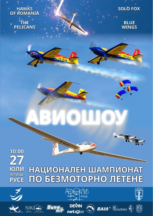 В 10:30 ч. публиката ще има възможност да види полет на конфигурация от самолетен влек с български планер, последван от скок с българското знаме, което ще развее единственият българин сред парашутистите. От 10:40 ч. шоуто продължава с впечатляващата програма на румънските пилотажни групи и парашутисти. Hawks of Romania представят пилотажна група с аеробатични самолети Extra 300L и Extra 330SC, докато The Pelicans демонстрират майсторството си със свръхлеки самолети Savannah S. Програмата включва и MDM SOLO FOX с демонстрационен пилотаж с планер и теглещ самолет Maule M7, както и Blue Wings Romania с демонстрационна парашутна формация.
