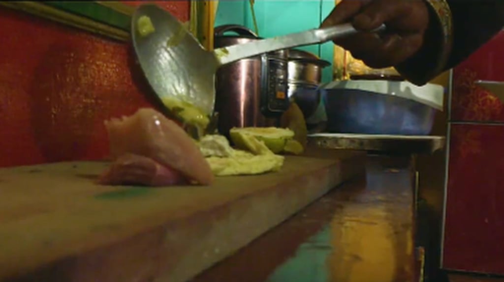 Подносът съдържа разнообразие от тибетски деликатеси, включително цампа, плосък хляб, масло, млечна утайка, говеждо, овнешко и напитки като високопланинско ечемично вино и чай с масло.