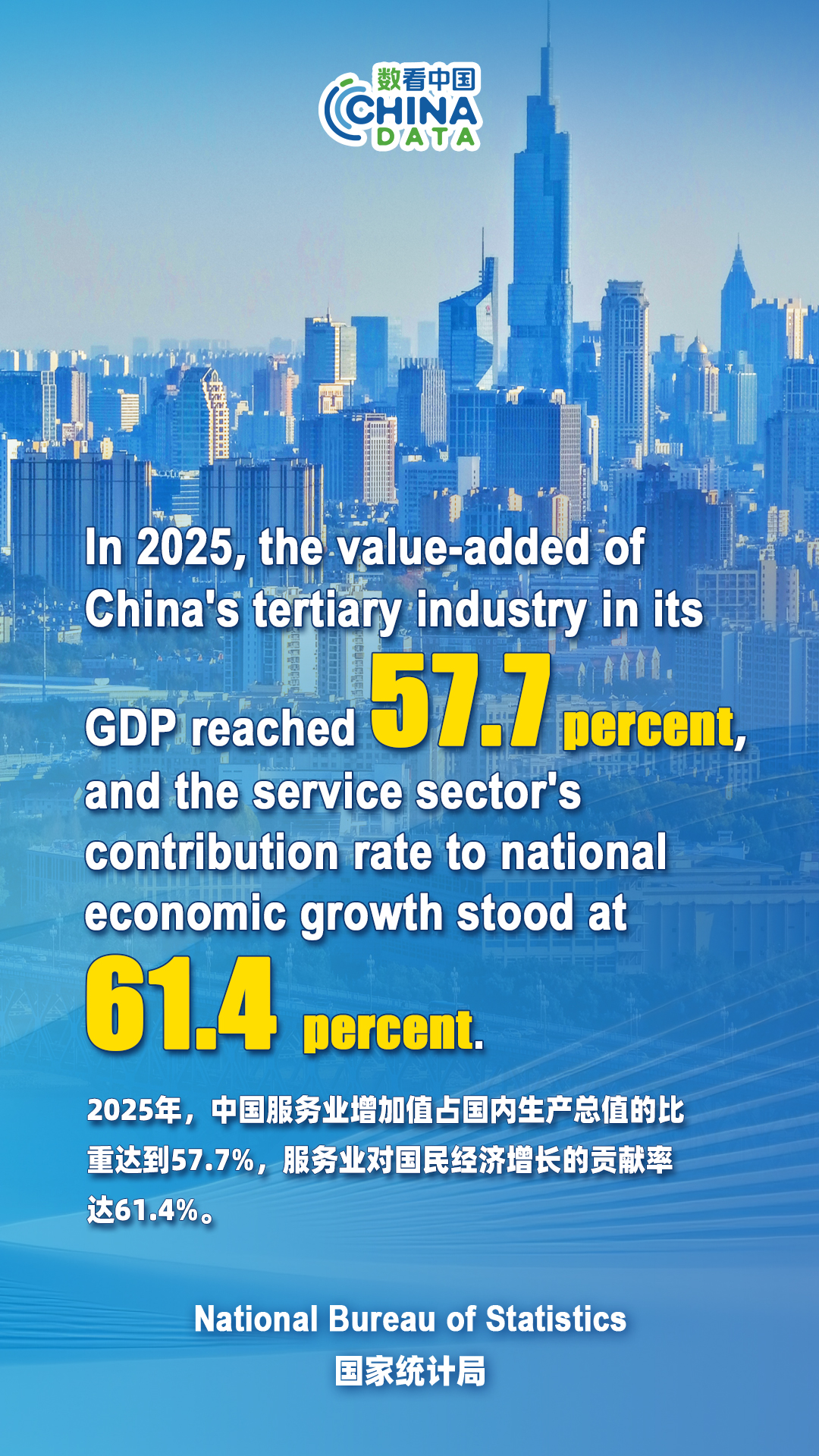 През 2025 г. ключовите сектори на услугите в Китай поддържат като цяло стабилен растеж. Добавената стойност на висшата индустрия на Китай в неговия БВП достигна 57,7 процента, а процентът на приноса на сектора на услугите към националния икономически растеж възлиза на 61,4 процента.