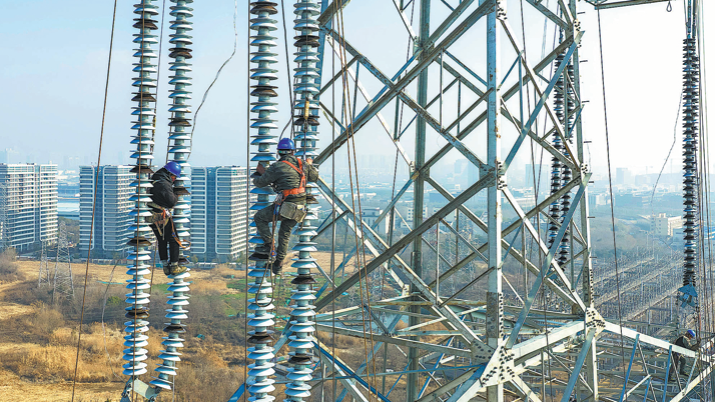 Строителни работници от Jiangsu Power Transmission and Transformation Co инсталират проводници на обект на проект за 500-киловолтова линия в Нанкин, провинция Дзянсу, в сряда. SHI JUN/ЗА КИТАЙ ДЕЙЛИ