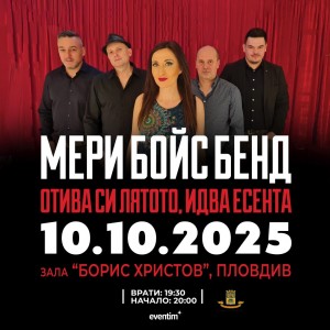 Мери Бойс Бенд кани на концерт в Пловдив, с най-големите си хитове и в точния сезон! Групата ще изнесе красив концерт с името на любимата фраза от най-популярната си песен – „Отива си лятото, идва есента“. Събитието е на 10 октомври 2025 г. (петък), от 20:00 ч., в Дом на културата „Борис Христов“, Пловдив.