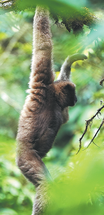 Женски гибон Skywalker hoolock скача в джунглите на националния природен резерват Gaoligongshan в Baoshan, провинция Yunnan, септември 2021 г. Kang Ping/China News Service