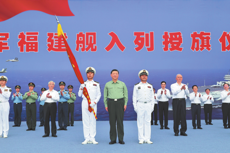 Президентът Си Дзинпин връчва флага на Народната освободителна армия на капитана и политическия комисар на CNS Fujian във военноморско пристанище в Саня, провинция Хайнан в Южен Китай, в сряда. Си присъства в сряда на церемонията по пускането в експлоатация и представянето на знамето на Fujian. LI GANG/XINHUA