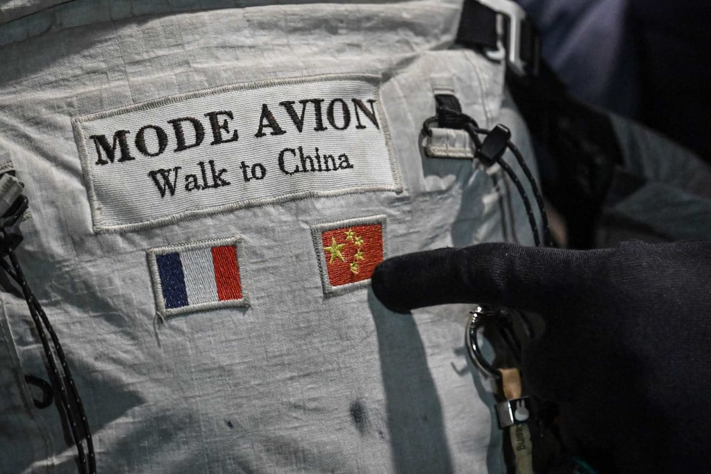 Французинът Loic Voisot сочи към раницата си, която включва френски и китайски флагове заедно с надписа „Mode Avion, Walk to China“ в Шанхай в събота. Снимка: AFPФранцузинът Loic Voisot сочи към раницата си, която включва френски и китайски флагове заедно с надписа „Mode Avion, Walk to China“ в Шанхай в събота. Снимка: AFP