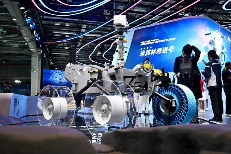 Тази снимка, направена на 6 ноември 2024 г., показва гума за луноход на Michelin по време на седмото Китайско международно изложение за внос (CIIE) в Шанхай в Източен Китай. [Photo/Xinhua]