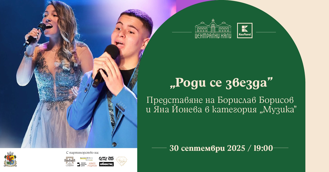 Двама млади изпълнители ще закрият септемврийското издание на инициативата „Роди се звезда“.На 30 септември от 19 ч. Борислав Борисов и Яна Йонева ще представят популярни песни на Сцена „Централни хали“. Борислав е лауреат от национални и международни конкурси по поп, джаз и народно пеене. Обучава се в Highlight Singing Academy – София с вокалния…
